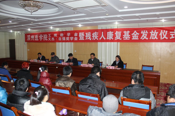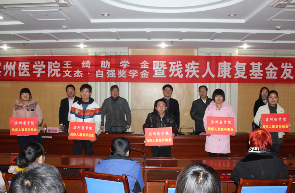 12月26日,学校举行滨州医学院“王绮助学金”“ 文杰·自强奖学金”暨残疾人大学生康复基金发放仪式。副院长李克祥出席仪式并为受到奖励和资助的残疾大学生颁奖,学校有关部门负责同志,特殊教育学院全体教师、获奖学生及部分残疾大学生参加发放仪式。