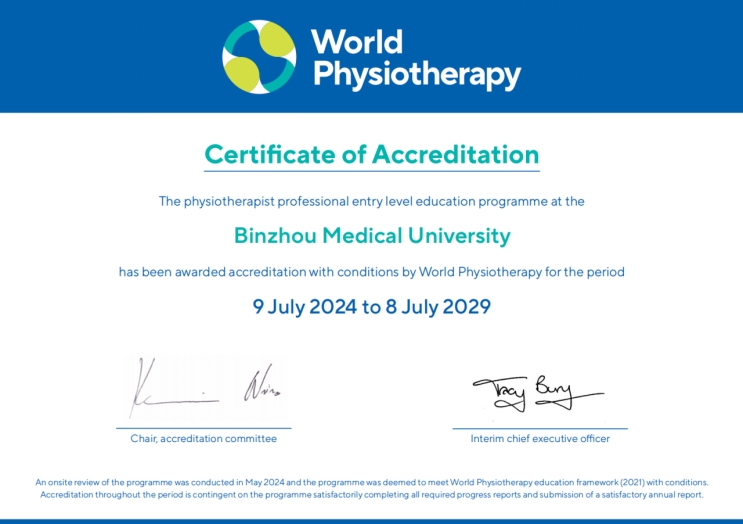 专业优势与特色 学院着眼国、内外康复医学的发展趋势,制定专业学科发展规划,2021年获批山东省一流本科专业;专业建设积极与国际接轨,2024年7月通过世界物理治疗联盟(WP)5年期国际认证。